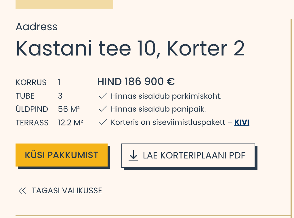 Näidis tootluse arvutamiseks valisin Kastani Kodu kolmetoalise korteri. Arenduse juures ei ole kohustust korteri juurde osta panipaika ning kõik korterid müüakse koos ühe parkimiskohaga ning lisaks saab osta lisaparkimiskoha. Panipaigad on samuti suurematel korteritel juba hinna sees ning panipaigad asuvad hoone esimesel korrusel.
